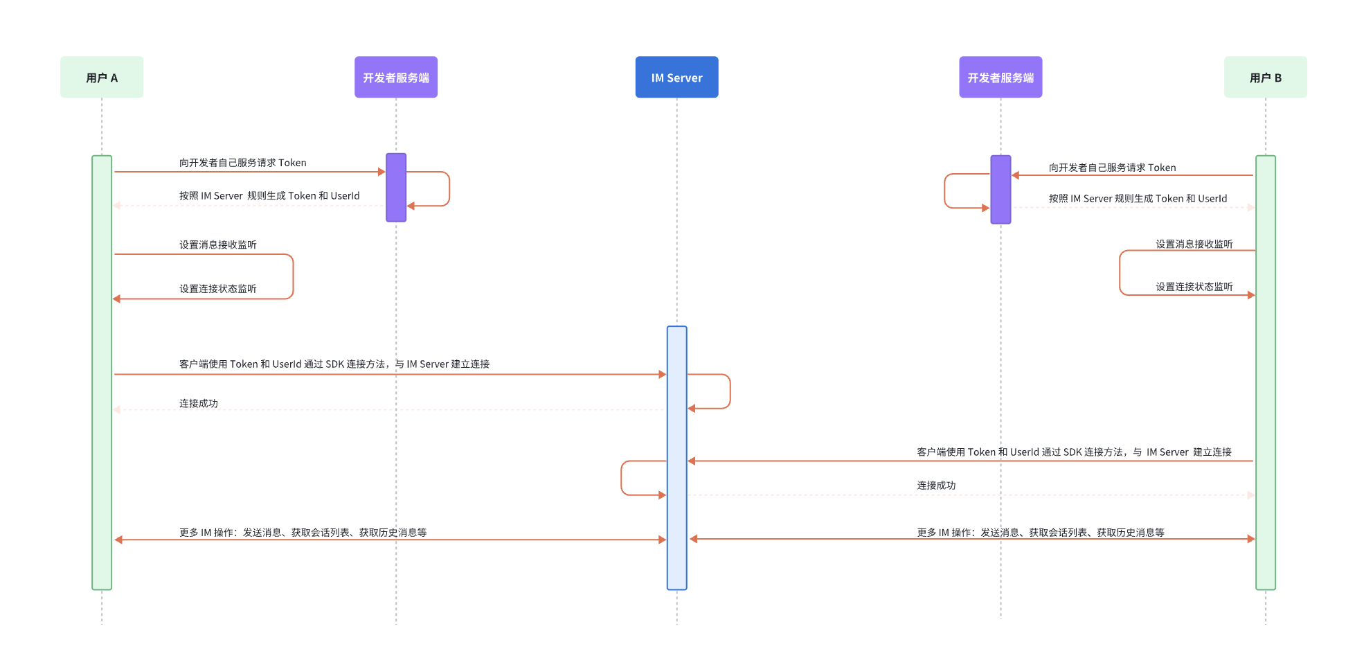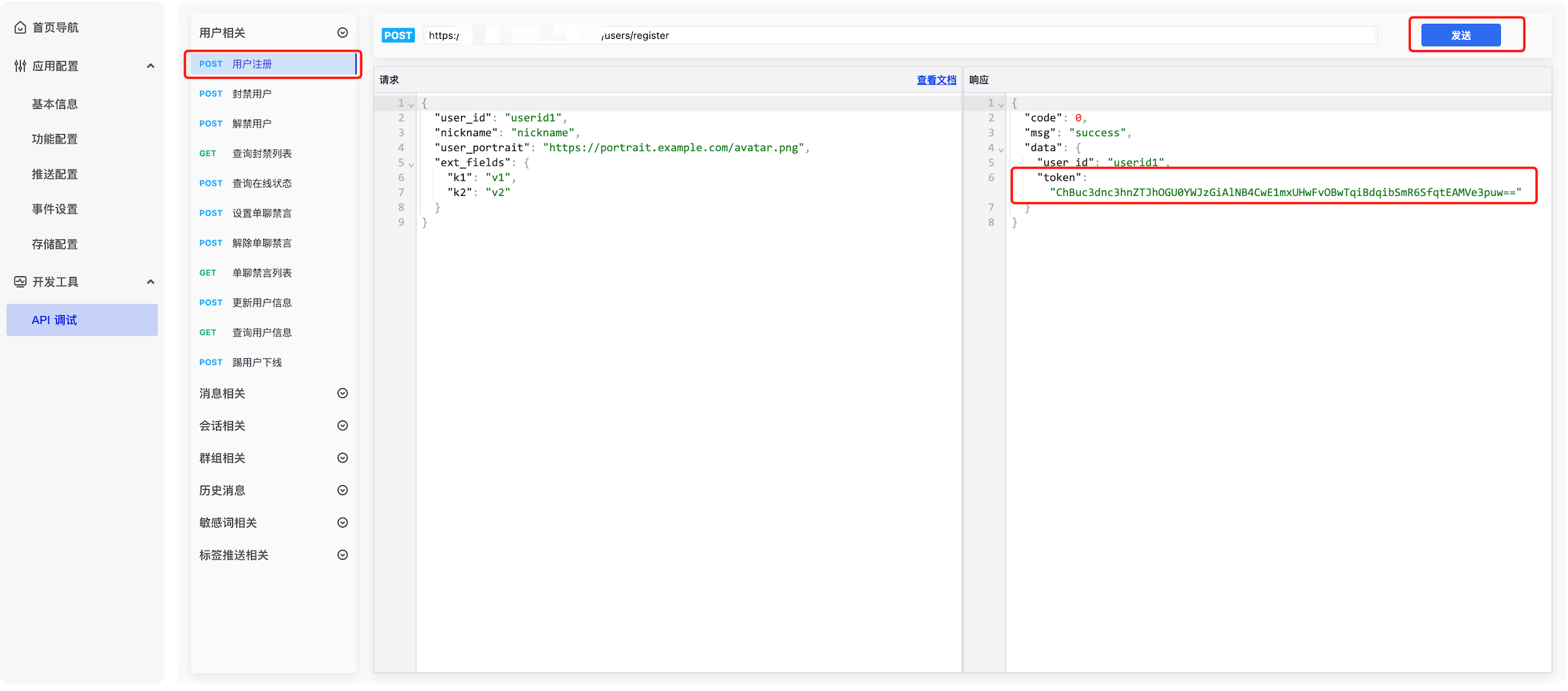 2、自己调用服务端 API 获取 Token 或在开发者后台的 -> 选择应用-> 开发工具 -> API -> 用户相关中,调用用户注册接口,获取两个测试 Token。