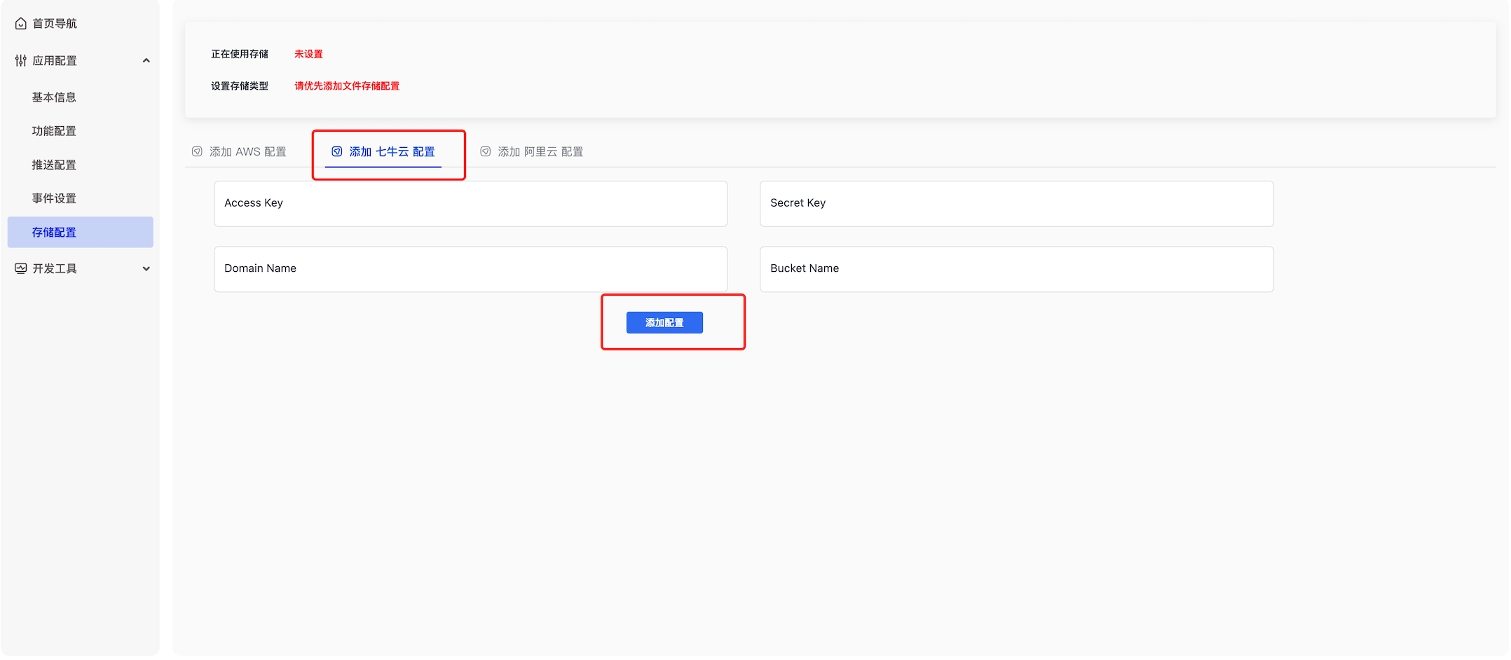 5、在开发者后台设置云存储类型,如果使用阿里 OSS,请在阿里云后台 设置允许 Web 端跨域