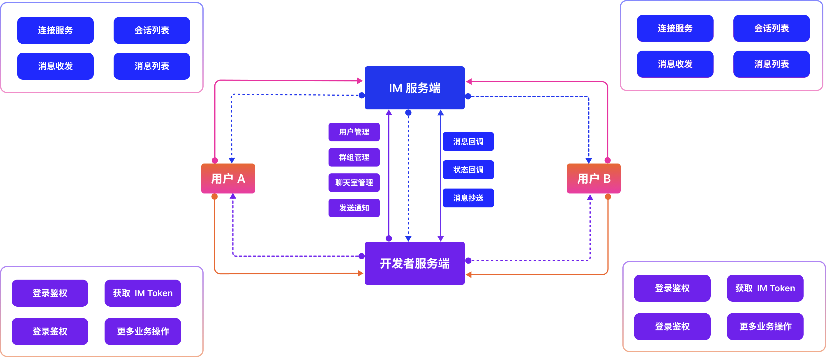 为了更好的和开发者服务进行互动融合,IM 服务提供覆盖 Android、iOS、Web、Electron 多端 SDK 组件,支持 IM 服务端 REST API 调用和 WebHook 回调事件,IM 服务提供用户信息和群组信息管理能力,开发者处理最新聊天列表和消息列表时无需单独获取对应的群组信息、用户信息,SDK 自动将群组、用户信息组装后返回给开发者业务层,开发者按需渲染即可完成 IM 能力搭建。