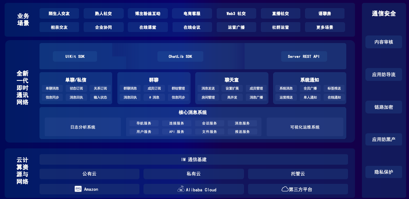 IM 即时通讯是日常工作生活必备的工具之一,我们每天都被文本消息、语音消息、图片消息等各种信息包围着,IM 通信能力自主化和数据存储安全化关注度日益增高,JIM 在此背景下推出全新一代 IM 即时通讯系统,支持开发者自主选择部署方式和数据存储位置,提供公有云和私有云两种模式,公私有部署模式 IM 功能完全一致,开发者可以根据业务发展阶段和特性灵活选择高自主化和数据自有存储的私有云,也可选择简单可靠开箱即用的公有云服务。